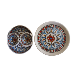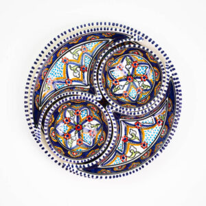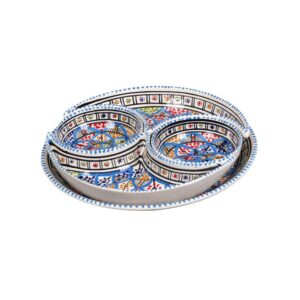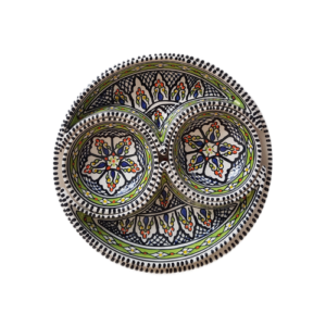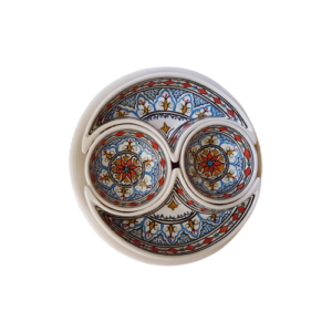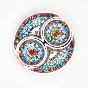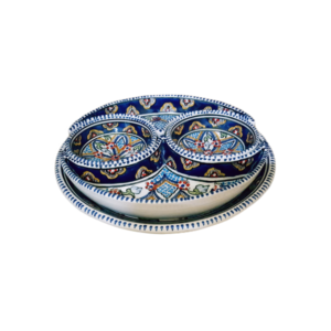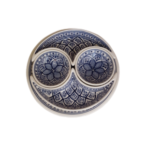 4 individual dishes making up the twin moons resting on a plate of the same shape. Can be used together or separately, ideal for entertaining.