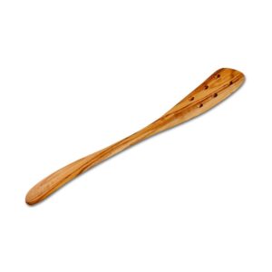 This olive wood spatula with holes is a must for every kitchen. Handcrafted and patterned by the natural grain of olive wood makes this a beautiful item to own.