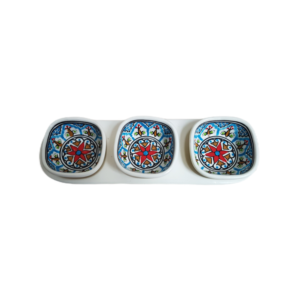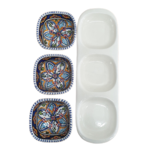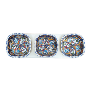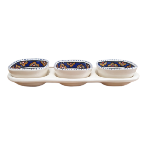 3 individual dishes making up the trio resting on a plate of the same shape. Can be used together or separately, ideal for entertaining.